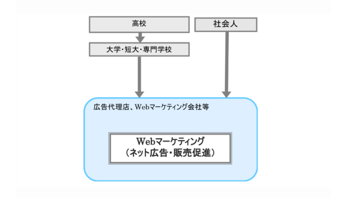 厚生労働省の統計によると、Webマーケティングの仕事を始めるには「広告代理店やWebマーケティング会社に入社すること」が、代表的なキャリアルートとして挙げられています。