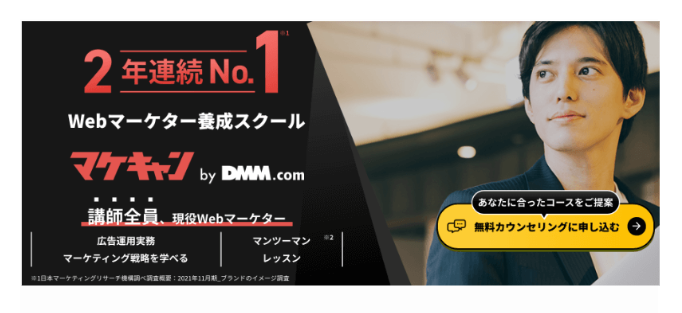 - マケキャンbyDMM.com【未経験から3ヶ月でWebマーケターになれる。受講料の最大70%支給の補助金制度あり】Webマーケティング就職・転職した後に副業したい方はここ