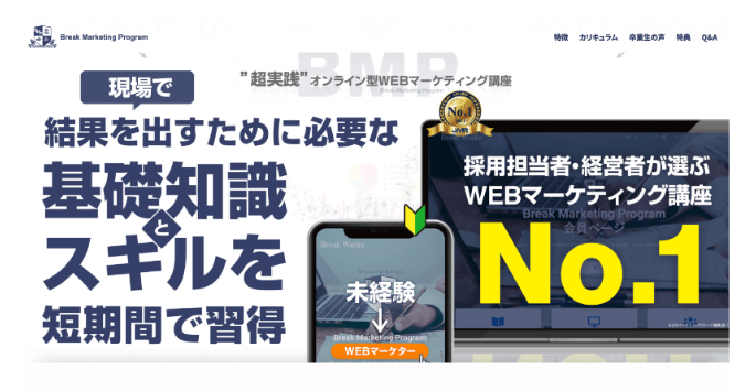 - 【第3位】Break Marketing Program【現場で結果を出すWebマーケターに。超実践的なスキルを学べるオンラインWebマーケティング講座。案件紹介あり。最大70%(32万円)OFFの補助金あり】
