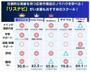 しかしながら、スクールも多数登場しており、費用や受講期間はさまざまなうえ、「リスナビ」、「Wannabe Academy(ワナビーアカデミー)」や「WEBMARKS 」、「デジプロ」、「マケキャン」など種類が多いです。