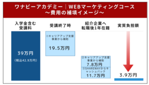 Webマーケティングスクールの費用は40万円を超えるものが多く、決して安い投資ではありません。コストパフォーマンスを意識して選ぶようにしましょう。また、最近では受講費の負担を大きく軽減可能な「リスキリング補助金」に対応した講座も増えていますので、必ずチェックしましょう。
